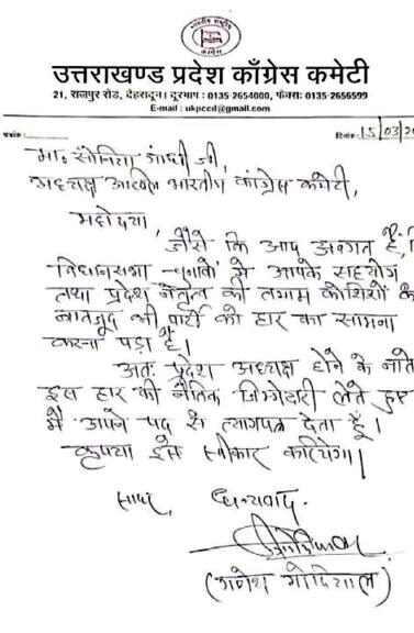 गणेश गोदियाल ने लिखा है कि प्रदेश में हुये विधानसभा चुनावों में पार्टी की हार की नैतिक जिम्मेदारी लेते हुए आज मैंने अपना इस्तीफा सौंप दिया है। मैं परिणाम के दिन ही इस्तीफा देना चाहता था पर हाईकमान के आदेश की प्रतीक्षा पर रुका था। आज दिल्ली पंहुच कर जैसे ही यह अवगत हुआ कि अन्य वह सभी राज्यों के जबावदेह पदाधिकारी, जहां चुनावों में आशातीत सफलता नहीं मिली, अपने पदों से इस्तीफा दे रहे हैं, मैंने भी अपना इस्तीफा सौंप दिया है। कांग्रेस के कार्यकर्ता के तौर पर संघर्ष करता रहूंगा।