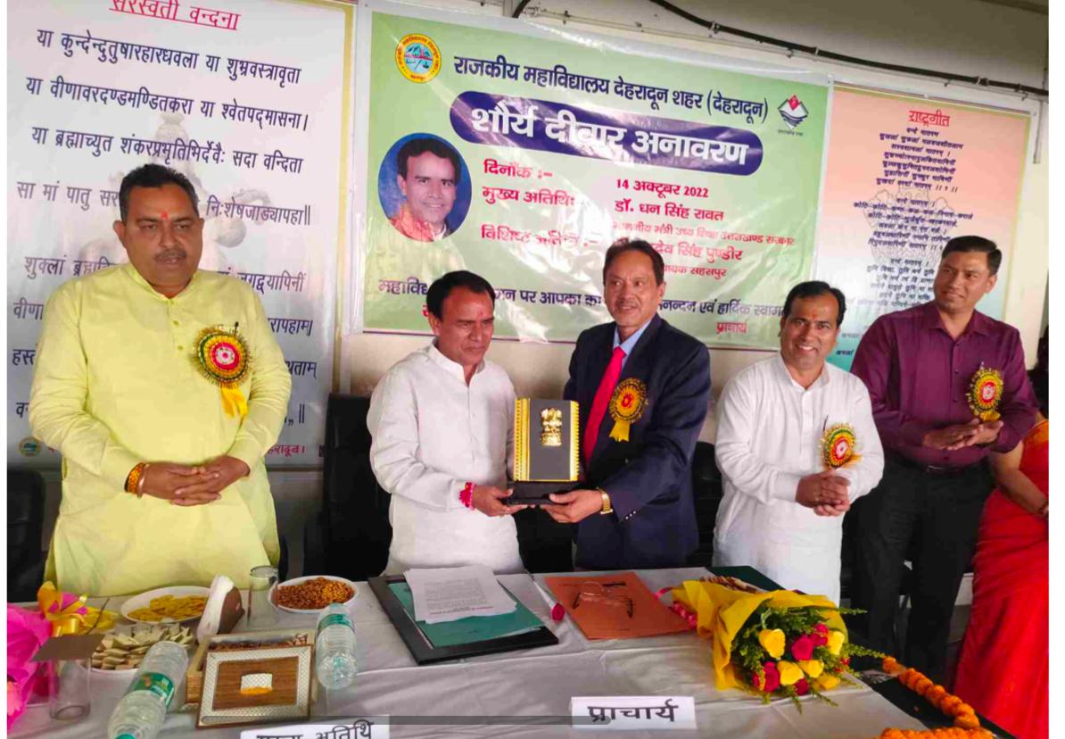 राजकीय महाविद्यालय देहरादून (शहर) में आज उच्च शिक्षा मंत्री डॉ0 धन सिंह रावत द्वारा शौर्य दीवार का अनावरण किया गया, जिसे ‘वीर भोग्य वसुंधरा’ नाम दिया गया है। डॉ0 रावत ने कहा कि शौर्य दीवार से युवाओं को देशभक्ति की प्रेरण मिलेगी, इसके लिये प्रत्येक शिक्षण संस्थान में शौर्य दीवार होना जरूरी है। उन्होंने कहा कि नवसृजित महाविद्यालय की तमाम समस्याओं को शीघ्र दूर कर दिया जायेगा साथ ही महाविद्यालय को दो माह के भीतर भूमि उपलब्ध करा दी जायेगी। इस संबंध में विभागीय अधिकारियों को निर्देश दे दिये गये हैं।