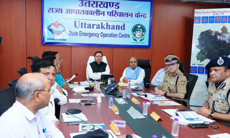 मुख्यमंत्री पुष्कर सिंह धामी उत्तराखण्ड राज्य आपातकालीन परिचालन केंद्र में सभी जिलाधिकारियों के साथ मानसून सीजन एवं आपदा प्रबंधन की तैयारियों की समीक्षा कर रहे थे।