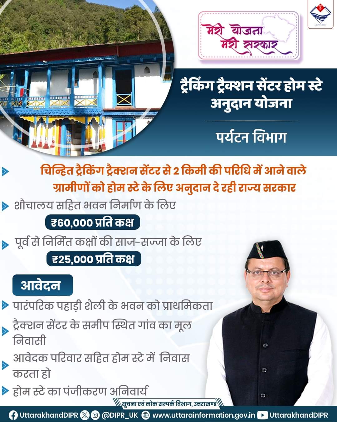 मुख्यमंत्री पुष्कर सिंह धामी की इच्छशक्ति के तहत, ट्रैकिंग ट्रैक्शन सेंटर होम स्टे अनुदान योजना के माध्यम से पर्यटन को बढ़ावा देने के प्रयास सतत पर्यटन विकास के लिए एक उल्लेखनीय दृष्टिकोण का प्रतिनिधित्व करते हैं। स्थानीय भागीदारी को प्राथमिकता देकर, पारंपरिक वास्तुकला को संरक्षित करके और वित्तीय सहायता प्रदान करके, उत्तराखंड सरकार एक ऐसा मॉडल बना रही है जो न केवल आगंतुकों के अनुभव को बढ़ाता है बल्कि स्थानीय समुदायों का उत्थान भी करता है। ये पहल एक संपन्न पर्यटन उद्योग को बढ़ावा देने की प्रतिबद्धता का उदाहरण है, जबकि यह सुनिश्चित करता है कि इस तरह के विकास का लाभ उत्तराखंड के लोगों के बीच समान रूप से साझा किया जाए।