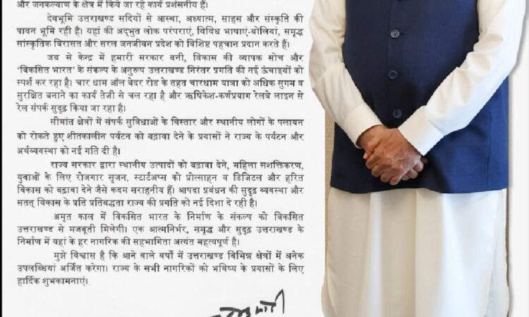 प्रधानमंत्री ने प्रदेश के सीमांत क्षेत्रों में कनेक्टिविटी बढ़ाने और शीतकालीन पर्यटन को प्रोत्साहित करने के प्रयासों को भी सराहा। उन्होंने कहा कि इन पहलों से न केवल पर्यटन को बढ़ावा मिला है, बल्कि पलायन रोकने और स्थानीय अर्थव्यवस्था को सशक्त बनाने में भी मदद मिली है। अपने संदेश में प्रधानमंत्री ने राज्य सरकार द्वारा स्थानीय उत्पादों के प्रोत्साहन, महिला सशक्तिकरण, युवाओं के लिए रोजगार सृजन, स्टार्टअप्स को बढ़ावा तथा डिजिटल और हरित विकास जैसे प्रयासों को सराहनीय बताया। साथ ही, आपदा प्रबंधन की सुदृढ़ व्यवस्था और सतत विकास के प्रति प्रतिबद्धता को राज्य की प्रगति के लिए महत्वपूर्ण बताया।