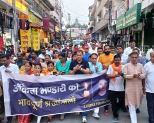 यमकेश्वर ब्लॉक के गंगा भोगपुर स्थित रिसॉर्ट में कार्यरत युवती के साथ हुई घटना की निंदा करते हुए भाजपा ऋषिकेश मंडल की ओर से आमजन के साथ कैंडल मार्च निकाला गया। इस दौरान उत्तराखंड की बेटी अंकिता भंडारी की आत्मीय शांति की कामना ईश्वर से की गई। साथ ही दो मिनट का मौन रखकर श्रद्धाजलि अर्पित की गई।