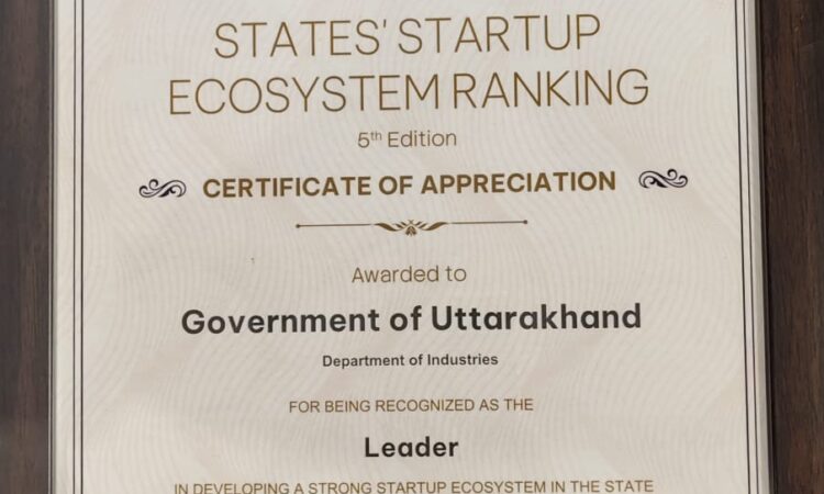 भारत सरकार के वाणिज्य एवं उद्योग मंत्रालय के अंतर्गत उद्योग संवर्धन एवं आंतरिक व्यापार विभाग (DPIIT) द्वारा जारी States’ Startup Ecosystem Ranking (5वां संस्करण) में उत्तराखण्ड को मजबूत स्टार्टअप इकोसिस्टम विकसित करने में ‘लीडर’ के रूप में मान्यता प्रदान की गई है। इस उपलब्धि के लिए राष्ट्रीय स्टार्टअप दिवस के अवसर पर उत्तराखण्ड सरकार के उद्योग विभाग को Certificate of Appreciation प्रदान किया गया।