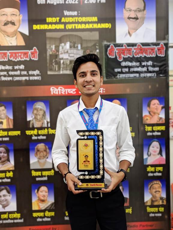 युवा शिक्षक राजेश को यह सम्मान उनके व उनके विद्यार्थियों के तीन बार सयुंक्त राष्ट्र संघ की कला प्रदर्शनी में उत्तराखंड व पर्यावरण की कला दर्शाने व कई और अंतरराष्ट्रीय उपलब्धियों के लिए मिला। हिमाद्रि फिल्म्स द्वारा आयोजित कार्यक्रम में मुख्य अतिथि सूबे के कबीना मंत्री सुबोध उनियाल सहित विशिष्ट अतिथि गढ़रत्न नरेंद्र सिंह नेगी, पद्मश्री डॉ प्रीतम भरतवाण, पद्मश्री जागर गायिका बसंती बिष्ट, लोक गायिका अनुराधा निराला, मीना राणा एवं कल्पना चौहान, हिमाद्रि फिल्म्स की निर्मात्री नीलिमा मिश्रा एवं प्रकाश मिश्रा द्वारा राजेश चन्द्र को इस विशिष्ट सम्मान से नवाजा गया।